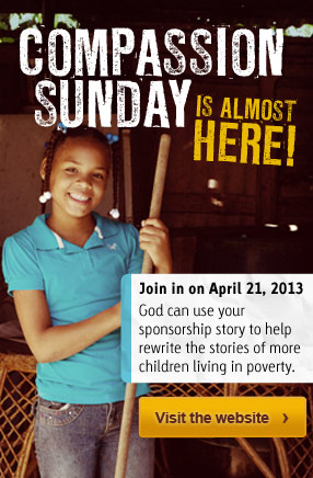 Compassion Sunday is a yearly event, drawing the attention of the Church to the needs of poor children...And I, as a sponsor, am participating! I get to talk about my story of Compassion here on my blog and at my Church.